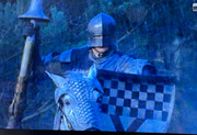Кольчуги в средние века тоже были. С щитами вопрос. Там, кстати, ребята наши вынули мечи из ножен... Насколько помню, ножны - привилегия рыцарей. Ножны и серый мех на плащах, если не ошибаюсь. Потом проверю. Т.е. у Берта меч без ножен, получается. Хотя странно, конечно.